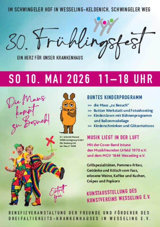 Am Sonntag, dem 11. Mai 2025 lud der Verein der Freunde und Förderer des Dreifaltigkeits-Krankenhauses e.V. , von 11.00 bis 18.00 Uhr zum 29. Frühlingsfest in die historische Hofanlage in Wesseling- Keldenich am Schwingeler Weg ein. Die Besucherinnen und Besucher des großen Benefizfestes zugunsten des Krankenhauses erwartete ein abwechslungsreiches Programm mit Musik, Kinderattraktionen, Kunstaustellung und vielem mehr. Für kulinarischen Genuss sorgte ein reichhaltiges Angebot mit herzhaften und süßen Leckereien.