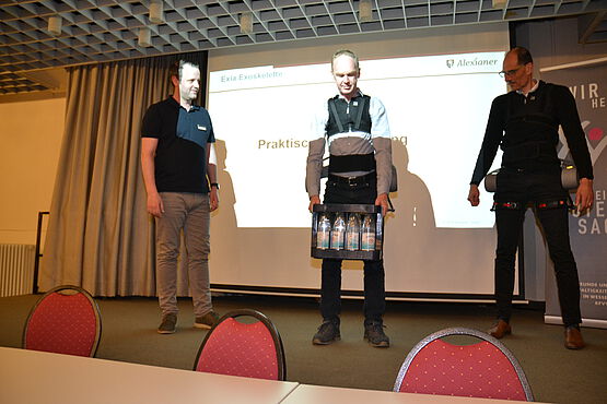 Tragehilfe und Rückenentlastung durch EXOSKELETT (Ärztlicher Direktor Dr. Scholer-Everts, stv. Plfegedirektor Michael Rupprecht, Dr. Klaus Ruberg)
