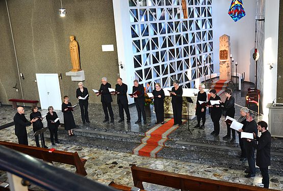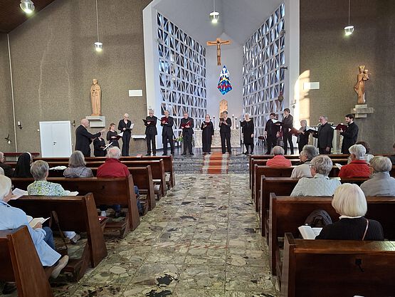 Der Brigidachor unter der Leitung von Chorleiter Jonas Dickopf (links im Bild) singt im Altarraum der Kirche Sankt Josef. Bild: Peter Siebert